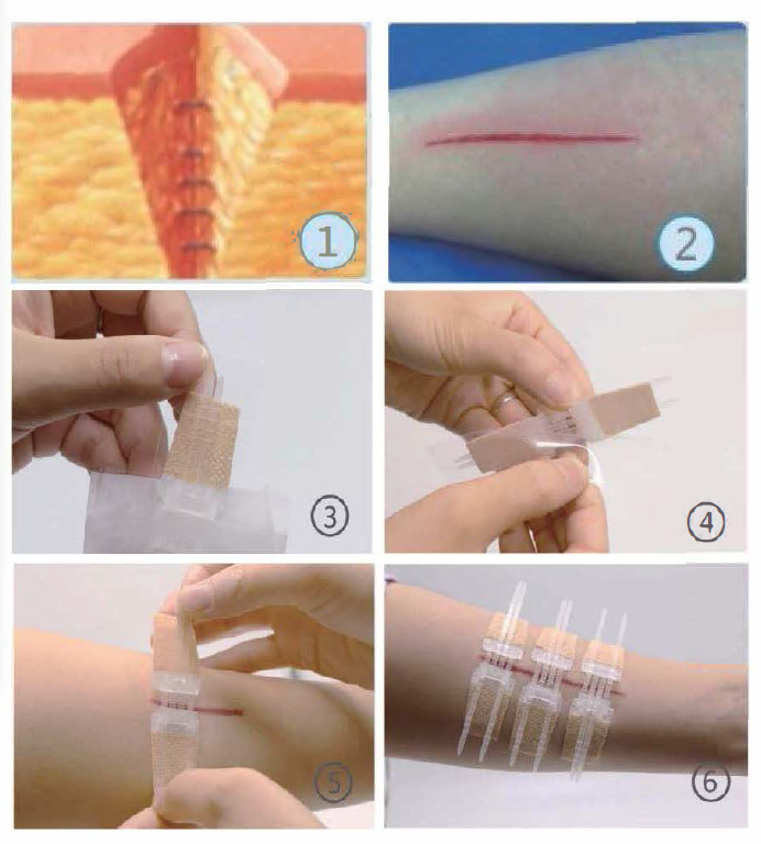 Das Produkt besteht aus einem medizinischen Klebeband. Ein Paar Polypropylen-Haspeln und eine Schutzfolie. Das Klebeband besteht aus einem porösen Vliesträger, der mit einem druckempfindlichen, hypoallergenen Klebstoff beschichtet ist. Der Hauptteil des Produkts besteht aus Polypropylen-Haspeln, die einen nicht-invasiven Wundverschluss ermöglichen und einen dichten Wundverschluss für eine schnelle Heilung fördern. Die nicht-invasive Technik reduziert Gewebetraumata, verbessert den Patientenkomfort und führt möglicherweise zu weniger Narbenbildung nach der Heilung.